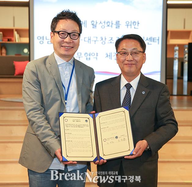 영남대(총장 노석균)가 대구창조경제혁신센터(센터장 김선일)와 지역 창조경제 활성화를 위한 사업개발과 운영을 위해 양 기관의 교류와 협력을 약속하는 양해각서를 체결했다.