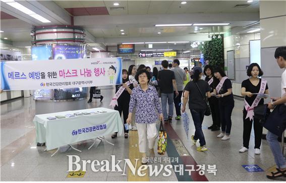 【브레이크뉴스 대구】이성현 기자= 한국건강관리협회 대구광역시지부(본부장 정혜인)는 사실상 지역에성의 메르스 상황이 마침표를 찍고 있지만 만약에 대비하기 위한 대시민 예방활동을 지속적으로 펼치기로 했다. 이를 위해 25일과 26일 양일간 지하철 반월당 환승역에서 역사이용객을 대상으로 마스크 나눔행사를 실시한다.