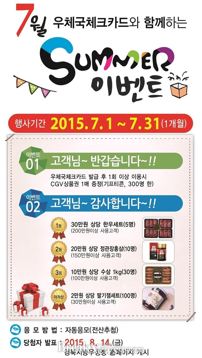 【브레이크뉴스 경북】이성현 기자= 경북지방우정청(청장 이병철)은 여름 휴가철을 맞이해 7월 한 달간 대구․경북지역 고객만을 대상으로‘우체국체크카드와 함께하는SUMMER이벤트’를 진행한다고 지난 28일 밝혔다.