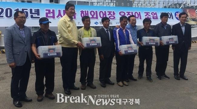 【브레이크뉴스 포항】김가이 기자= 올해 러시아 어장으로 오징어를 잡으러 가는 배 66척의 안전과 만선을 기원하는 환송식이 1일 포항시 구룡포항에서 김관용 경북도지사와 이강덕 포항시장, 수협 관계자, 어업인들이 참석한 가운데 열렸다.