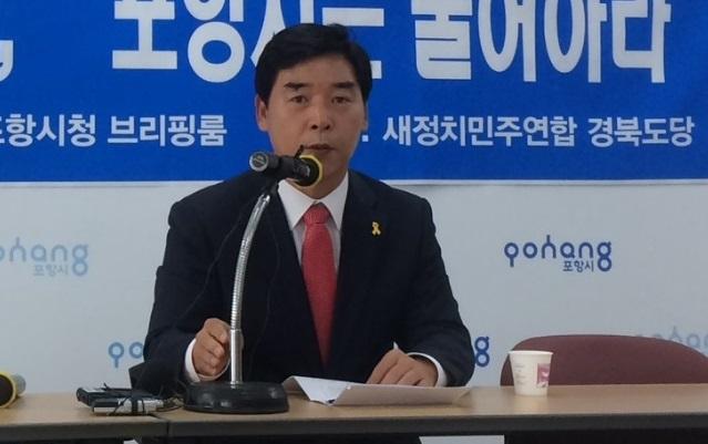 【브레이크뉴스 포항】김가이 기자= 새정치민주연합 경북도당 오중기 위원장은 6일 오전 11시 10분 포항시청에서 기자회견을 열고 두호동 롯데마트 입점에 대한 포항시의 입장 번복은 “배신의 행정“이라고 말했다.