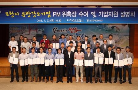 이날 위촉장을 받은 PM은 포항금속소재산업진흥원(POMIA), 포항산업과학연구원(RIST), 나노융합기술원(NINT), 한국로봇융합연구원(KIRO) 소속의 석박사급 연구원으로 포항시 유망강소기업과 1:1 매칭을 통해 17명으로 구성됐다.