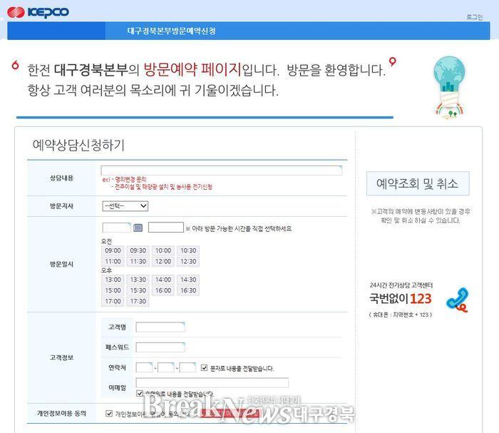【브레이크뉴스 대구】이성현 기자= 한전 대구경북지역본부(본부장 박원형)는 7월부터 ‘방문예약 홈페이지’를 개설해 관공서 최초로 인터넷 복합민원 방문예약 서비스를 실시하고 있다.