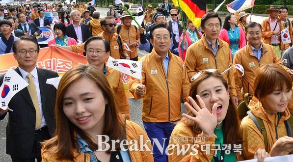 200여명이 참석한‘통일기원 대행진’에는 동포 유학생들과 경북도에서 파견한‘철의 실크로드 탐험대’가 한데 어우러져 뜨거운 열기를 쏟아냈다. 특히, 실크로드 탐험대는 삼국통일의 위업을 달성한 화랑정신을 이어받는다는 취지로 화랑복장으로 행진해 주위의 이목을 끌었다.