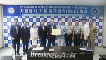 【브레이크뉴스 문경】이성현 기자 = 문경대학교가2015경북문경세계군인체육대회의 성공 개최를 위해 재학생 450여명을 지원한다. 이를 위해 문경대는 11일 ‘2015경북문경세계군인체육대회 조직위원회’를 찾아 자원봉사자 지원 업무협약을 체결했다. 협약식은 김상기 조직위원장과 문경대학교 신영국 총장 등 관계자들이 참석한 가운데 열렸다