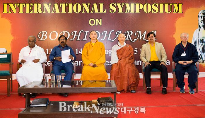 | ▲ 심포지엄 모습(왼쪽에서 네 번째 동국대 경주캠퍼스 선연구소장 진월 스님) © 동국대학교 경주캠퍼스 제공 | | 【브레이크뉴스 경북】김가이 기자= 동국대학교 경주캠퍼스(총장 이계영) 선연구소(소장 진월 스님)는 지난 13일부터 14일까지 인도 아시아학연구소에서 ‘보리달마’에 대한 국제 심포지엄을 공동 개최했다. 이번 심포지엄은 지난해 동국대 경주캠퍼스 선연구소와 인도 아시아학연구소의 교류 협약 체결에 따른 것으로, 인도 정부의 지원과 중국의 소림사, 일본의 세계보리달마협회, 홍콩의 보리달마보편연합, 모리셔스의 타밀디아스포라국제협회 등 18개국 80여명의 학자와 전문가들이 참여했다. 심포지엄은 동국대 경주캠퍼스 선연구소장 진월 스님의 ‘한국의 보리달마 유산과 영향’에 대한 주제 발표와 차문화연구소의 선차 시연, 보리달마의 고향인 칸치프람과 중국행 포구였던 마하마르프람 등 문화유산 답사로 진행됐다. 동국대 경주캠퍼스 선연구소장 진월 스님(불교학부 교수)는 “이번 심포지엄은 양 연구소간 연구 및 학술대회 협력에 대한 구체적인 실현”이라며 “앞으로 선연구소와 아시아학연구소의 긴밀한 협력을 통해 상호 발전하고 국제 학술교육협력을 증대할 수 있도록 최선을 다하겠다”고 말했다.