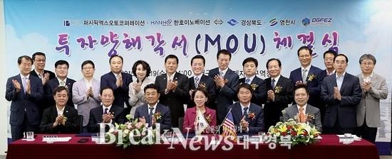 【브레이크뉴스 경북】이성현 기자= 대구경북경제자유구역청(청장 도건우)은 19일 이인선 경상북도 경제부지사와 김영석 영천시장, 한호이노베이션 강동한 대표 등이 참석한 가운데 투자양해각서(MOU)를 체결했다.