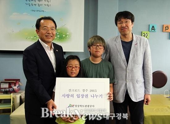 【브레이크뉴스 경북】이성현 기자 = 경상북도관광공사(사장 김대유)와 노동조합(위원장 강윤구)은 21일 개막하는 ‘실크로드 경주2015’ 대축전을 맞아 지역소외계층에 입장권을 기부했다.