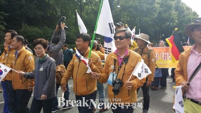 【브레이크뉴스 포항】김가이 기자= 허명환 중앙공무원교육원 객원교수는 지난 17일 도라산 역에서 개최된 평화통일 기원 ‘유라시아친선특급 해단식’에 윤병세 외교부장관, 최연혜 코레일사장, 강창희 전국회의장 등과 함께 참석했다. 허 교수는 해단식에서 “우리가 ‘섬나라 대한민국(육로를 통해 대륙으로 가지 못하는 분단의 현실)’이라는 인식을 탈피할 경우 러시아 등 북방대륙은 새로운 도약의 기회가 될 땅으로서, 특히 영일만신항이 있는 포항은 그 혜택을 직접 누릴 수 있는 지역이기에 보다 많은 관심과 노력이 필요하다“고 말했다. 이날 친선특급단의 시베리아 횡단 동안 각자 희망의 메시지를 적은 조각천을 바느질로 꿰매 만든 대형태극기를 윤주경 독립기념관장에게 기증, 영구보관토록 했는데, 허 교수의 “뉴욕 보다 먼 평양, 뉴욕 보다 가까운 평양으로”라는 문구가 참석자들의 주목을 받았다.