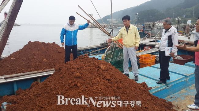 | ▲ 남정면 구계항의 황토 살포 현장을 방문해 점검중인 이희진 영덕군수 모습 © 영덕군 제공 |