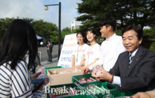 | ▲ 등교하는 재학생 500여명에게 ACE대학 홍보물과 빵, 유유를 나눠주며 격려하는 이계영 동국대 경주캠퍼스 총장 모습 © 동국대 경주캠퍼스 제공 |