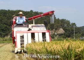 【브레이크뉴스 포항】김가이 기자= 포항시가 3일 장기면 금곡리 이규수(66세) 씨 논에서 추석 햅쌀용 첫 벼베기를 실시했다.