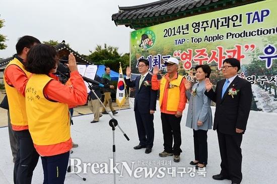 【브레이크뉴스 경북】이성현 기자 = 영주시는 고품질 영주사과 주산단지의 명성을 이어가고, 사과농업인의 사과생산 기술력 향상을 목표로 '2015년 영주사과인 TAP(Top Apple Production) 성공다짐 대회를 7일 풍기인삼축제 특설무대에서 개최했다.