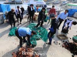 포항 클린오션 봉사단원 및 울릉군 특수수난구조대 40여명은 24일 호미곶면 구만2리를 찾아 어장 내 성게와 불가사리 등 해적생물을 구제하는 한편 어업활동과 안전에 지장을 초래하는 생활쓰레기, 폐어구 등을 수거하며 구슬땀을 흘렸다.