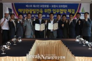 【브레이크뉴스 포항】김가이 기자= 베스트웨스턴 포항호텔(총지배인 최선학)은 포항요트협회(회장 장영구)와 27일 호텔 6층 연회장에서 해양관광 발전 및 관광객 유치를 위한 업무 협약을 체결했다고 밝혔다.