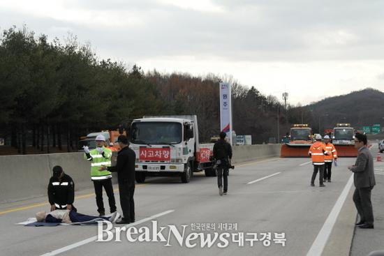 【브레이크뉴스 경북】이성현 기자 = 한국도로공사와 국민안전처, 국토교통부 등 유관기관 관계자들이 17일 오후 2시 중앙고속도로 원주휴게소에서 폭설대비 합동훈련을 실시했다. 이 날 훈련에서는 중앙고속도로 원주~횡성 구간의 집중폭설로 인해 대형화물차가 전복돼 연쇄추돌이 발생한 상황을 설정해 실시됐다.