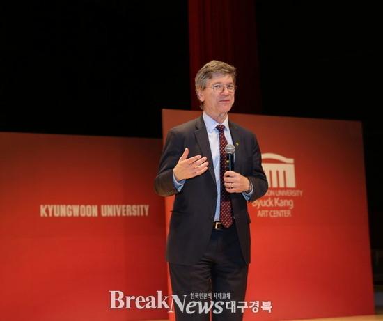 【브레이크뉴스 경북】이성현 기자 =UN의 밀레니엄 빌리지조성사업 자금조성을 위한 비 영리기구인 MP(Millennium Promise)의 설립자이자 총책임자인 제프리 삭스(Jeffrey Sachs) 교수가 24일 경운대학교(총장 김향자)를 찾았다.