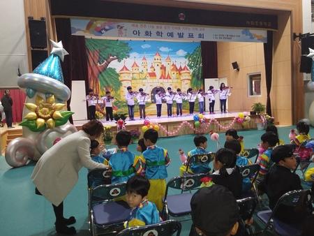 이날 학예발표회는 첫인사를 윤우진(유치원)박주연(1학년)의 환영인사와 함께 시작했다. 첫순서로 아화초등학교와 공동교육을 진행중인 내남초등학교8인조 보컬밴드의 우정출연을 시작으로, 2개교의 합동공연인 오카리나합주,트로트댄스(유치원윤우진외14명)기타합주(6학년 박채린외11명)태권무(3학년이겸외8명)난타(6학년김도영외15명)리코드합주(5학년 박지호외10명)레크레이션댄스(2학년송진우외14명)바이올린합주(5학년김진우외11명)을 선보여 많은 박수를 받았다.