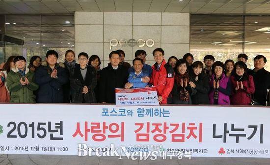 이번 김장김치 나눔은 제때 월동준비를 마치지 못한 포항지역 내 독거노인·장애인 등 어려운 이웃들과 따스한 정을 나누고 더불어 사는 따뜻한 사회분위기 조성에 적극 앞장서자는 취지에서 경북사회복지공동모금회(회장 신현수)의 ‘2015년 포스코 지정기탁사업’ 기금 4천500만원으로 마련됐다.