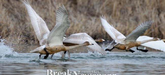 【브레이크뉴스 포항】김가이 기자= 천연기념물 제201호, 멸종위기야생동식물 2급으로 지정돼 보호받고 있는 겨울철새 큰고니 떼가 8일 포항시 북구 흥해읍 곡강천에서 힘찬 날갯짓으로 날아오르고 있다.