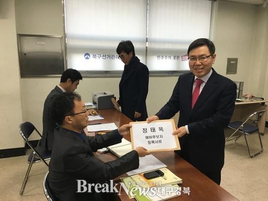 정태옥 전(前) 대구시 행정부시장은 15일 아침 대구북구선거관리위원회를 찾아 북구 갑 예비후보자 중 첫 번째로 등록서류를 제출했다.