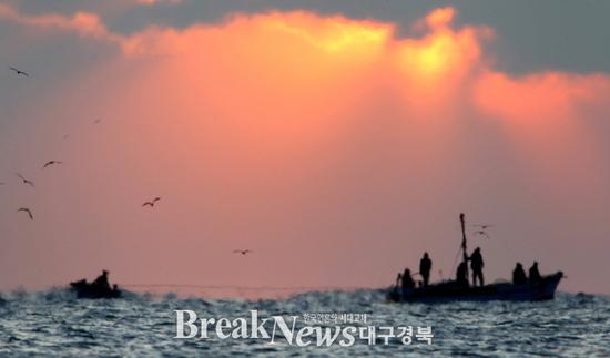 【브레이크뉴스 포항】김가이 기자= 17일 포항시 남구 구룡포 연안에서 어민들이 정치망 어선을 타고 새벽 조업을 하고 있다.