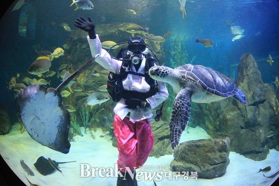 【브레이크뉴스 울진】박영재 기자= 울진군(군수 임광원)은 엑스포공원 울진아쿠아리움(운영 사이엑스)에서 2016년 새해를 맞아 아쿠아리움을 찾는 관람객을 위해 아쿠아리스트와 함께하는 한복 피딩쇼 특별이벤트를 시행한다고 밝혔다.