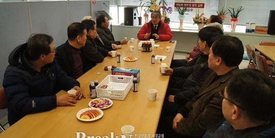 | ▲ 박승호(가운데) 예비후보가 6일 선거사무소를 찾은 포항시체육회 전무이사협의회 임원진들과 체육발전에 대해 의견을 나누고 있다. © 박승호후보 제공 |