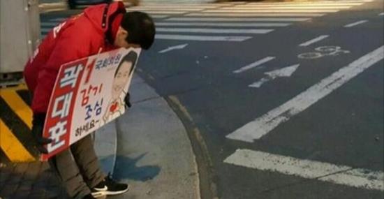 그는 지난 주 자신의 지지를 부탁하는 팻말 대신 '감기 조심하시라'는 팻말을 들고 나왔다.이른 아침 추워진 날씨에 예비후보가 자신의 지지 대신 주민들의 간강을 걱정하는 모습을 보고 주민들은 '참 열심히 한다', '팻말을 보니 훈훈해진다'며 곽 예비후보에 큰 응원을 보냈다.