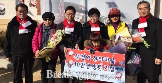 기념식에는 전화식 경상북도 문화관광체육국장을 비롯, 김동룡 봉화부군수, 최연혜 코레일 사장 등이 참석해 10만 번째 행운의 주인공과 함께 중부내륙순환열차(O-Train)를 타고 산타마을을 찾은 방문객들에게도 떡을 나눠주며 ‘산타마을 방문객 10만 명 돌파’를 축하했다.