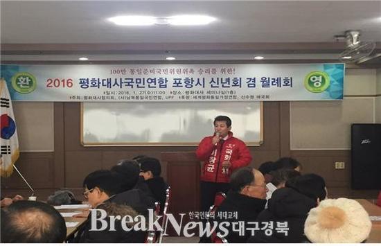 이어 100만 통일준비국민위원위촉 승리를 위한 2016 평화대사국민연합 포항시 신년회겸 월례회에 참석해 "국민의 통일에 대한 의지를 결집시키고 한반도 평화통일의 주역이 되기 위한 평화대사의 노력에 감사드린다"며 “남북 상호간 민간차원의 교류 등 협력방안에도 적극 나서겠다”고 축사를 했다.