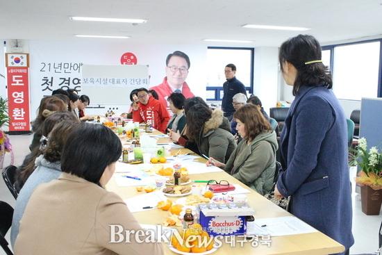 【브레이크뉴스 대구】이성현 기자 = 도영환(전 달서구의회의장) 달서구청장 예비후보는 28일 선거사무소에서 관내 보육시설 대표자와 간담회를 열고 영유아 보육 환경 및 보육교사 고용 안정과 처우 개선 등 보육 현안 문제에 대해 의견을 수렴했다.