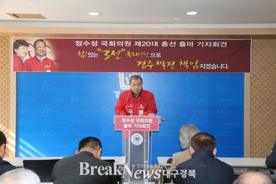 【브레이크뉴스 경주】이성현 기자 = 새누리당 정수성 국회의원(경북 경주, 윤리특별위원장)이 2일 오전 11시 경주시청 브리핑실에서 기자회견을 갖고 제20대 총선 출마를 공식 선언했다. 정 의원이 예비등록을 하고 공식적으로 선거운동에 나서면서 지역 정서가 어떤 변화를 가져올지 기대된다.