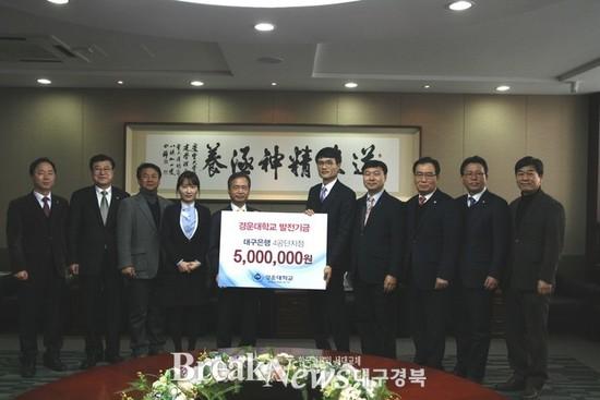 【브레이크뉴스 구미】이성현 기자= 대구은행 구미4공단지점 서정오 지점장은 지난 3일 오전 경운대 대학본부를 방문해 대학발전을 위해 써달라며 대학발전기금 500만원을 기탁했다고 4일 밝혔다.