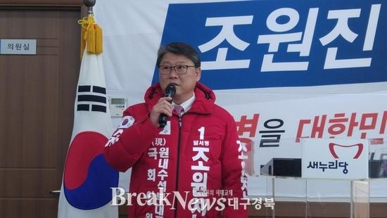 반대로 지역에서는 너무 자만하는 거 아닌가라는 여론들이 있을 수 있어 상황을 알린다는 차원에서 오늘 예비후보 등록을 했다” 조원진 의원이 기자회견 전 모두 발언을 통해 참석한 주민들에게 인사한 말이다. 조원진, 3선 도전에 강력한 의지 나타내 【브레이크뉴스 대구】이성현 기자= 그는 5일 선관위에 예비후보 등록을 마쳤다. 조 의원이 등록을 하면서 대구에서는 서상기, 주호영 의원만 제외하고 모든 현역들이 예비후보등록을 마쳤다. 그는 이날 기지회견을 통해 3선 도전에 대한 의지를 분명히 밝히면서 ‘사회적 약자와 정의가 승리하는 대한민국 건설이 꿈’이라고 했다. 그는 “집권여당의 원내 수석부대표를 맡아 일하고 또 일했다’며 “좌고우면하지 않았다”고 강조했다. 이어 “이제는 중앙에서 인적네트워크도 갖췄고, 국가예산을 대구시와 달서구로 가져올 수 있는 전문성도 높였다”고 자부했다. 이를 통해 그는 박근혜 정부의 개혁성공과 인정받는 의정활동, 그리고 따뜻한 리더쉽을 통해 건강한 달서구를 만들겠다고 약속했다.특히, 그는 이같은 일을 하기 위해서는 3선의 힘 있는 국회의원이 필요하다고 거듭 강조했다.