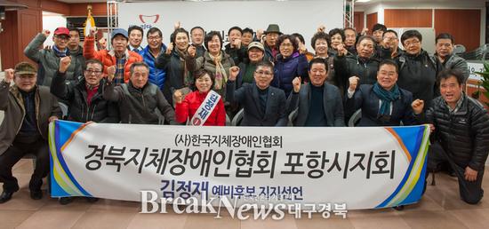 【브레이크뉴스 포항】김가이 기자= (사)한국지체장애인협회 경북지체장애인협회 포항시지회(회장 이경목)가 11일 오후 2시 김정재 국회의원 예비후보(포항 북) 선거사무소를 찾아 공개 지지를 선언했다.