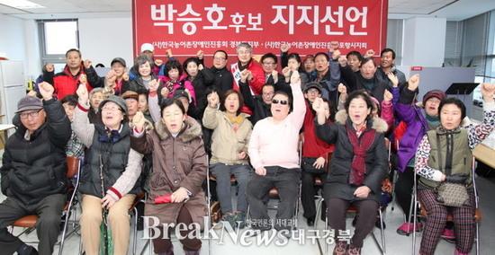 【브레이크뉴스 포항】김가이 기자= 새누리당 포항 북 박승호 국회의원 예비후보는 지난 12일 한국농어촌장애인진흥회 경북지부(지부장 김규)와 포항시지회(지회장 공재덕) 회원 40여명이 선거사무소를 찾아 공개지지를 선언했다고 14일 밝혔다.