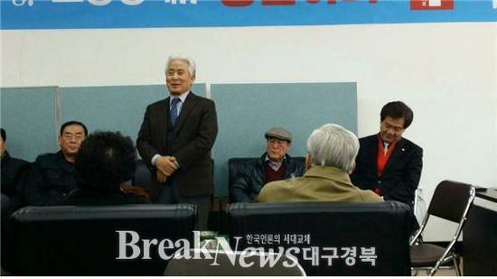 【브레이크뉴스 포항】김가이 기자= 새누리당 포항 북 허명환 국회의원 예비후보 선거사무실에 지난 20일 오후 2시 허화평 전 의원이 지역 지인, 지지자들과 함께 깜짝 방문을 했다고 지난 21일 밝혔다. | ▲ 허명환 후보 사무실에서 소감을 밝히고 있는 허화평 전의원 © 허명환후보 제공 |