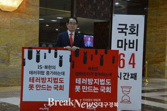 【브레이크뉴스 포항】김가이 기자= 박명재 의원은 26일 테러방지법 처리에 반대하는 야당에 맞서 국회 본회의장 앞에서 피켓시위에 나섰다.