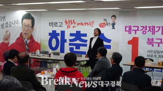 【브레이크뉴스 대구】이성현 기자 = 하춘수 대구북구갑 새누리당 예비후보 선거사무실에서 바리톤 이응광 씨의 깜짝 콘서트가 열렸다.
