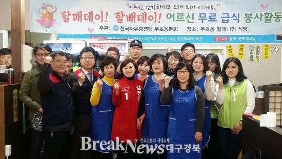 【브레이크뉴스 포항】김가이 기자= 새누리당 포항 북 김정재 국회의원 예비후보는 지난 19일 한국자유총연맹 두호동분회가 주관하는 ‘어르신 무료급식 봉사활동(두호동 밀레니엄 식당)’을 찾아 바쁜 선거 일정 중에도 봉사활동을 이어갔다고 20일 밝혔다.