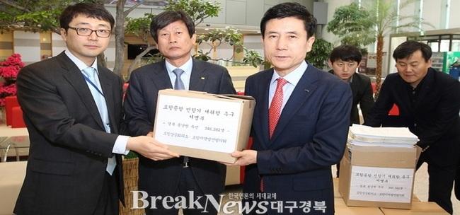 【브레이크뉴스 포항】김가이 기자= 포항시(시장 이강덕)가 포항공항 민항기 재취항을 촉구하는 경북 동남권 주민들의 염원이 담긴 서명부가 30일 국토교통부와 항공사에 전달됐다고 30일 밝혔다.