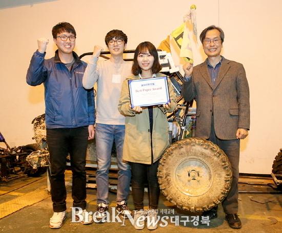 【브레이크뉴스 대구】이성현 기자=영남대는 자작자동차동아리 ‘YUSAE’에서 활동 중인 기계공학부 이순기(24, 4년), 염승제(22, 3년), 이윤화(21, 4년) 학생 등이 ‘제1회 국제 전기자동차·스마트그리드·정보기술 국제학회(ICESI, The 1st International Conference on Electric Vehicle, Smart Grid, and Information Technology)’에서 우수논문상(Best Paper Award)을 수상하고,산업통상자원부장관상을 받았다고 8일 밝혔다.