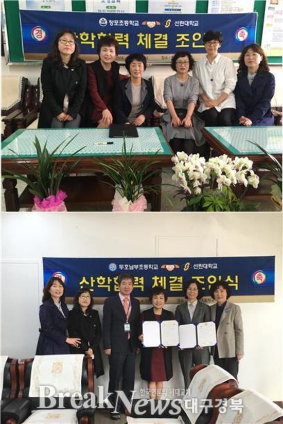 ▲ 산학협력 체결 조인식 모습(위 창포초, 아래 두호남부초) © 선린대학교 제공