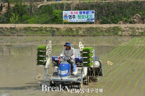 【브레이크뉴스 영주】 원용길 기자= 영주시(시장 장욱현)는 쌀값 하락에 대비하고 이른 추석을 겨냥하여 지난해 보다 1주일 정도 빠른 20일 안정면 오계리 김진석 농가(2,000㎡)를 시작으로 본격적인 모내기를 시작했다고 20일 밝혔다.