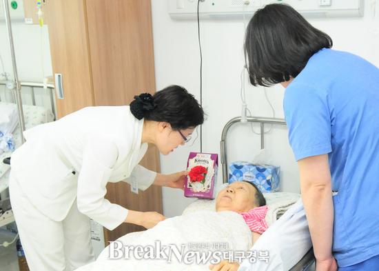 【브레이크뉴스 포항】김가이 기자= 포항성모병원은 어버이날에 앞선 지난 6일 입원병동을 찾아 카네이션 달아드리기 행사를 실시했다고 지난 7일 밝혔다. 포항성모병원에 따르면 이날 행사는 포항성모병원 간호사회에서 보호자 없이 입원 중인 65세 이상 어르신을 직접 찾아가 정성껏 준비한 선물과 함께 직접 만든 카네이션을 달아드리는 등 병상에 누워계신 어버이들의 노고에 깊은 감사의 뜻과 함께 쾌유의 메시지를 전했다. | ▲ 병상에 누워계신 어르신에게 카네이션과 선물을 증정하고 있다. © 포항성모병원 제공 |