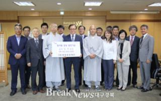 【브레이크뉴스 경주】김가이 기자= 동국대학교 경주캠퍼스(총장 이대원)는 영축문화재단(이사장 현문 스님)이 17일 오전 10시 교내 백주년기념관에서 발전기금 1억원을 전달했다고 17일 밝혔다.