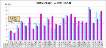 실제 주요 상승지역으로는 신도청이 자리한 인근 예천군이 16.38%로 가장 높은 상승률을 보였으며, 울릉군 15.57%, 영천시 14.01%로 각각 안동·예천 신도시조성사업, 울릉 일주도로 개설사업, 영천경마공원 조성사업 등이 상승요인으로 나타났다. 도내 최저상승 지역은 포항시 남구(3.68%)로 전국 평균을 밑도는 것으로 파악됐다.