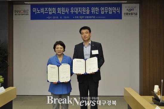 【브레이크뉴스 대구】이성현 기자 =(사)중소기업기술혁신협회(이노비즈협회) 대구경북지회는 15일 신용보증기금 본부 회의실에서 신용보증기금 대구경북본부(본부장 남상종)와 “이노비즈협회 회원사 우대지원을 위한 업무협약”을 체결했다.