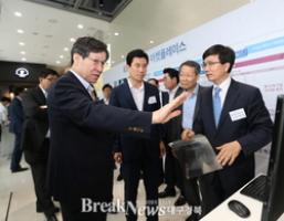 | ▲ 사진은 포스코 권오준 회장(좌측 첫번째), 이강덕 포항시장(좌측 두번째) 등 행사 참석자들이 ㈜에스에스에이디티 이호덕 대표(우측 첫번째)로부터 3D 화면 구현기술에 대한 설명을 듣고 대화를 나누고 있는 모습 © 포스코 제공 |